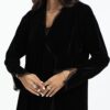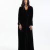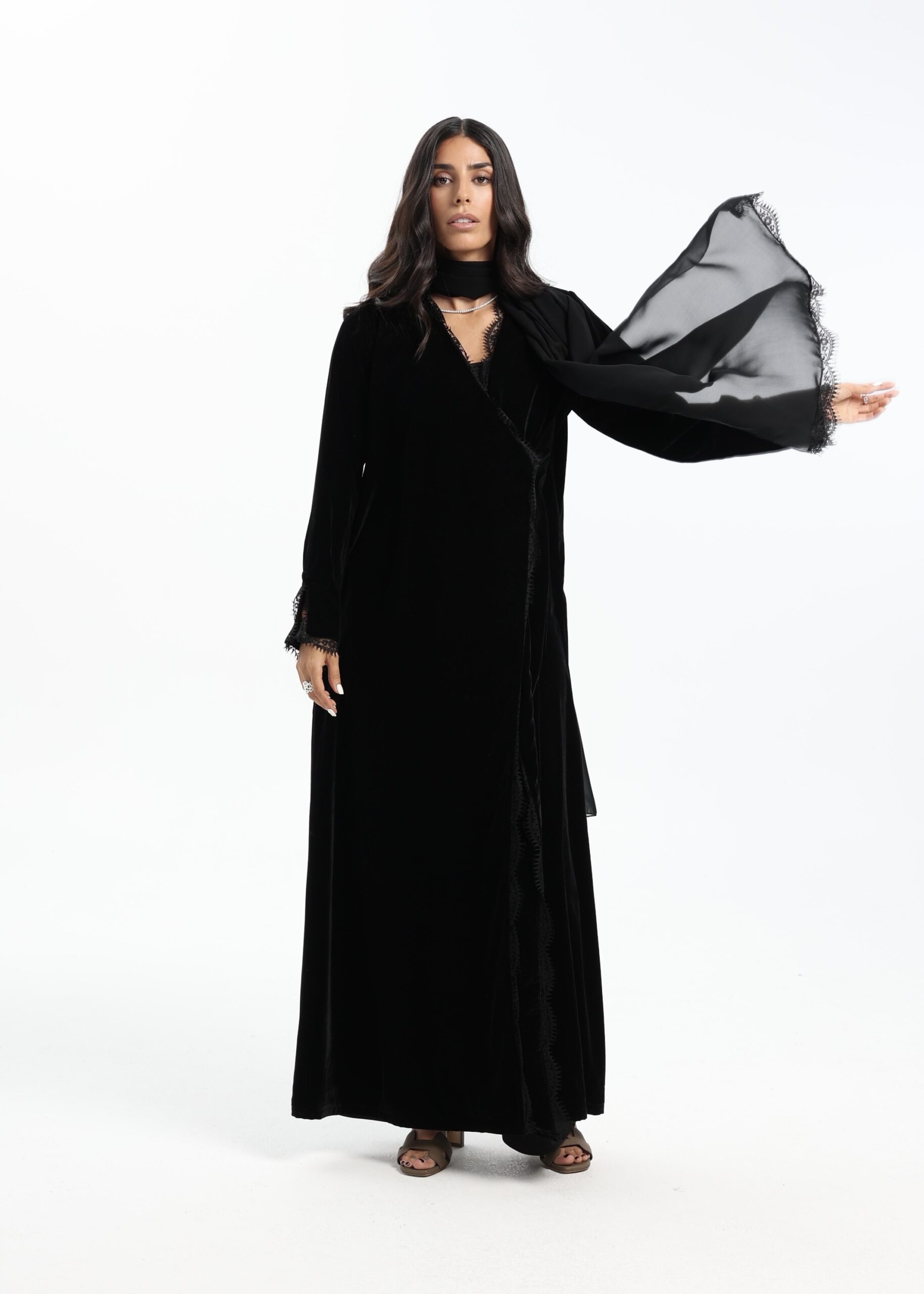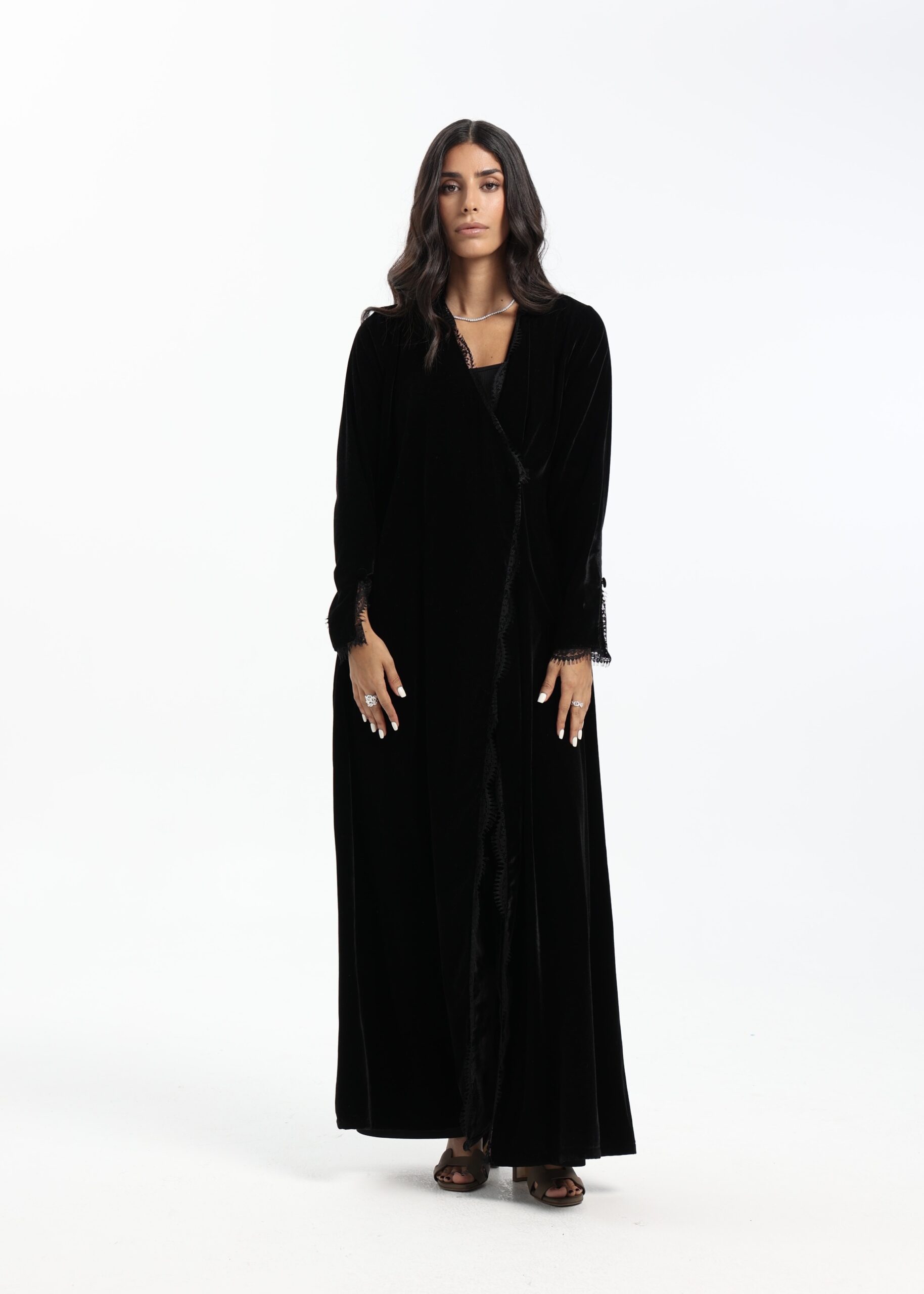 A velvet abaya with delicate lace detailing and fluid sleeves, designed for an elegant evening finish.